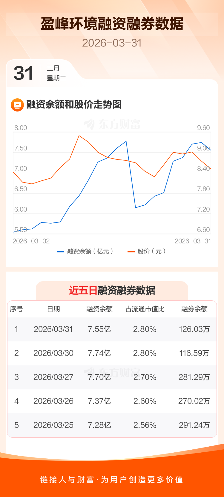 交易所最新数据显示,盈峰环境于2026年3月31日获融资买入7458.32万元,融资偿还9371.00万元,当日融资净偿还1912.67万元。目前,该股融资余额7.55亿,占流通市值比例为2.80%。