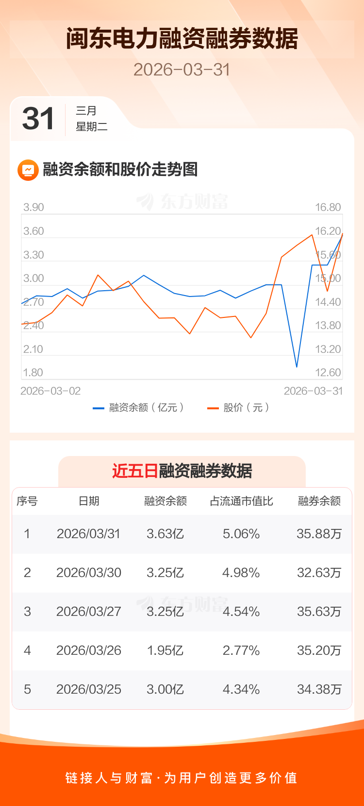 交易所最新数据显示,闽东电力于2026年3月31日获融资买入7857.22万元,融资偿还4069.41万元,当日融资净买入3787.81万元。目前,该股融资余额3.63亿,占流通市值比例为5.06%。