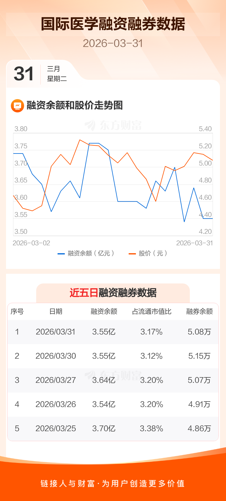 交易所最新数据显示,国际医学于2026年3月31日获融资买入1824.35万元,融资偿还1831.24万元,当日融资净偿还6.89万元。目前,该股融资余额3.55亿,占流通市值比例为3.17%。