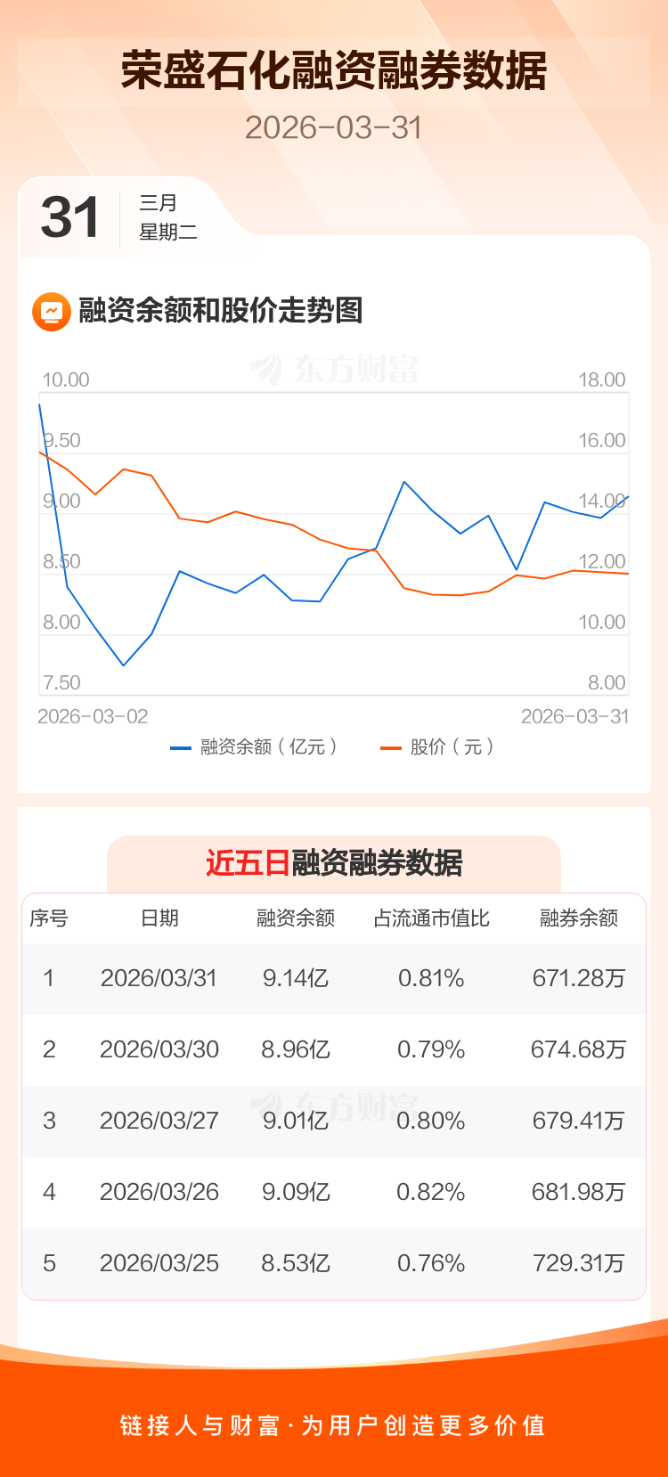交易所最新数据显示,荣盛石化于2026年3月31日获融资买入4302.78万元,融资偿还2475.01万元,当日融资净买入1827.77万元。目前,该股融资余额9.14亿,占流通市值比例为0.81%。