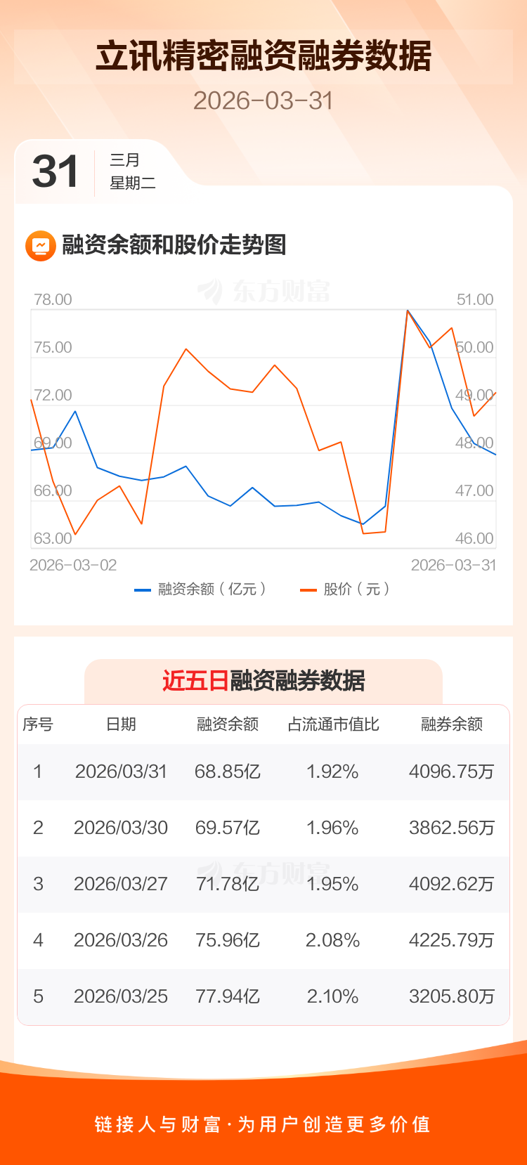交易所最新数据显示,立讯精密于2026年3月31日获融资买入6.03亿元,融资偿还6.74亿元,当日融资净偿还7131.69万元。目前,该股融资余额68.85亿,占流通市值比例为1.92%。