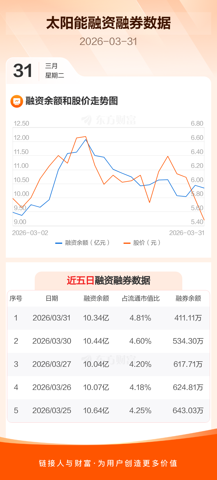 交易所最新数据显示,太阳能于2026年3月31日获融资买入7916.77万元,融资偿还8868.32万元,当日融资净偿还951.55万元。目前,该股融资余额10.34亿,占流通市值比例为4.81%。