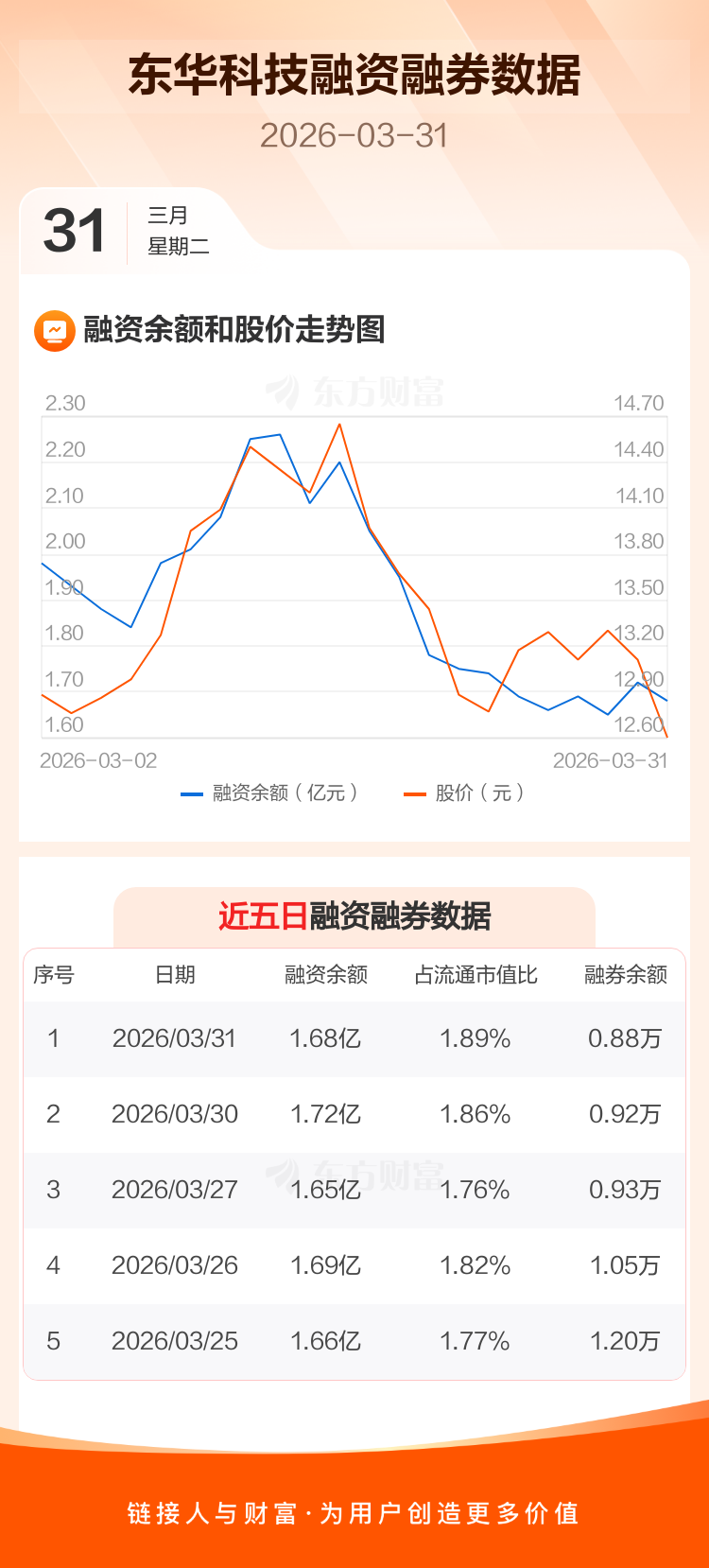 交易所最新数据显示,东华科技于2026年3月31日获融资买入2219.33万元,融资偿还2628.50万元,当日融资净偿还409.18万元。目前,该股融资余额1.68亿,占流通市值比例为1.89%。