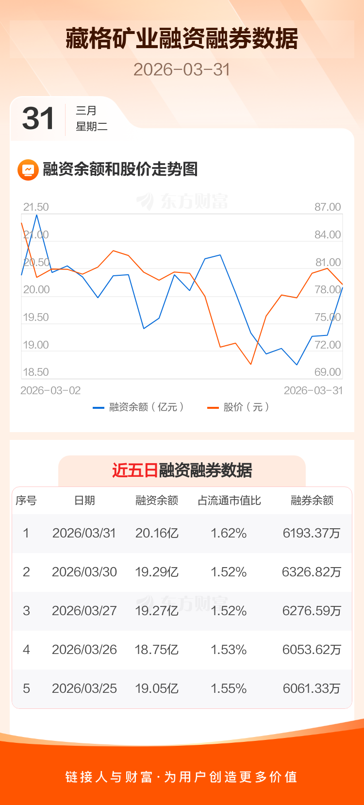 交易所最新数据显示,藏格矿业于2026年3月31日获融资买入1.92亿元,融资偿还1.05亿元,当日融资净买入8705.28万元。目前,该股融资余额20.16亿,占流通市值比例为1.62%。