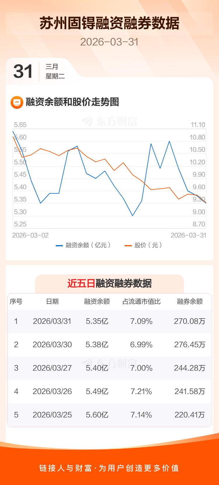 交易所最新数据显示,苏州固锝于2026年3月31日获融资买入939.20万元,融资偿还1272.94万元,当日融资净偿还333.74万元。目前,该股融资余额5.35亿,占流通市值比例为7.09%。