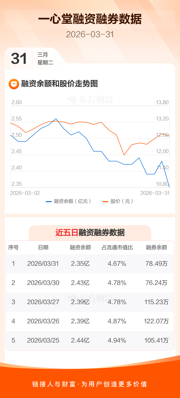 交易所最新数据显示,一心堂于2026年3月31日获融资买入285.23万元,融资偿还1048.21万元,当日融资净偿还762.98万元。目前,该股融资余额2.35亿,占流通市值比例为4.67%。