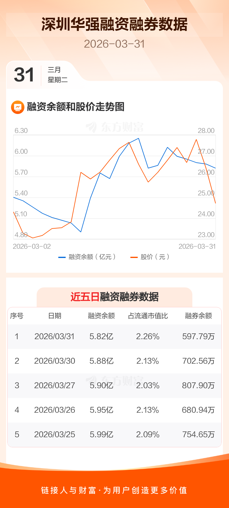 交易所最新数据显示,深圳华强于2026年3月31日获融资买入8281.92万元,融资偿还8864.99万元,当日融资净偿还583.07万元。目前,该股融资余额5.82亿,占流通市值比例为2.26%。