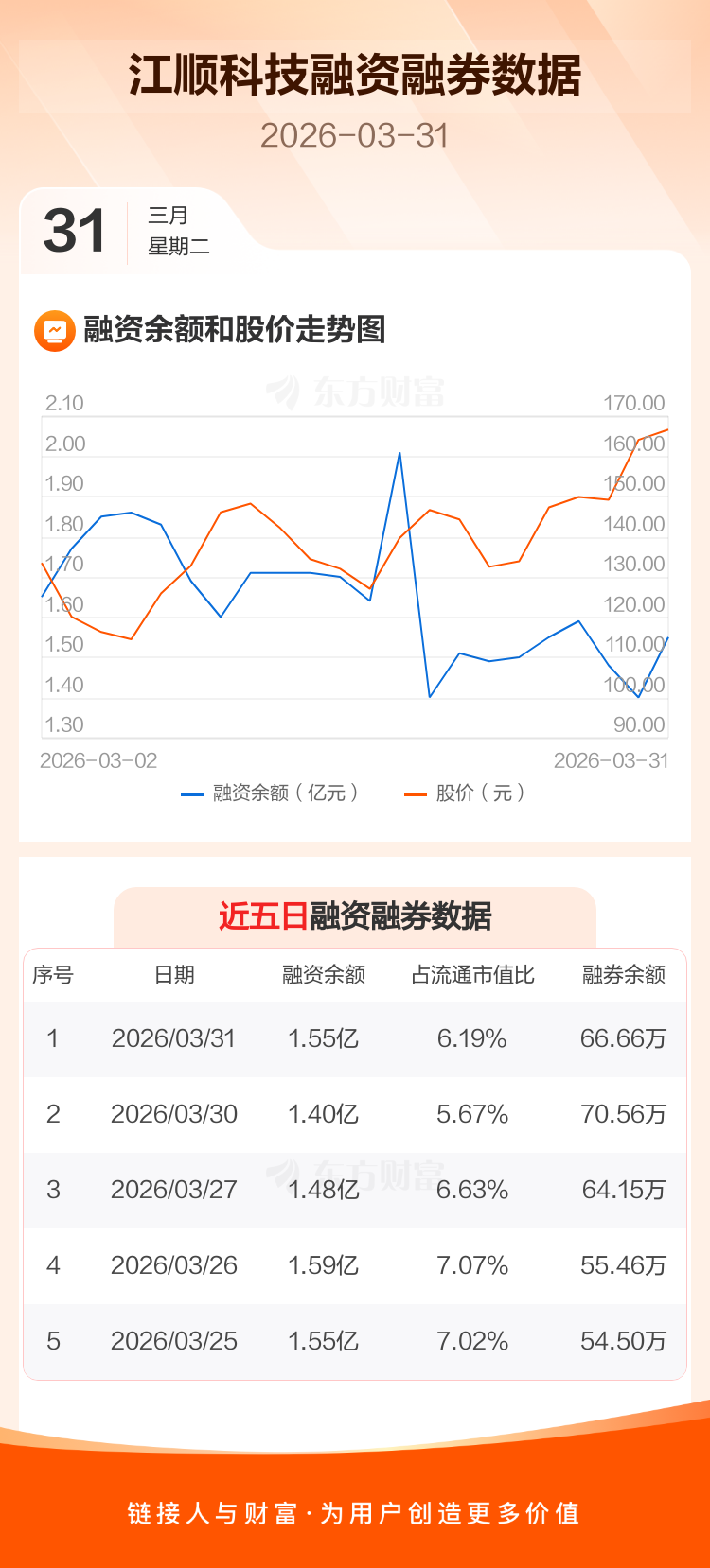 交易所最新数据显示,江顺科技于2026年3月31日获融资买入6685.28万元,融资偿还5158.91万元,当日融资净买入1526.37万元。目前,该股融资余额1.55亿,占流通市值比例为6.19%。