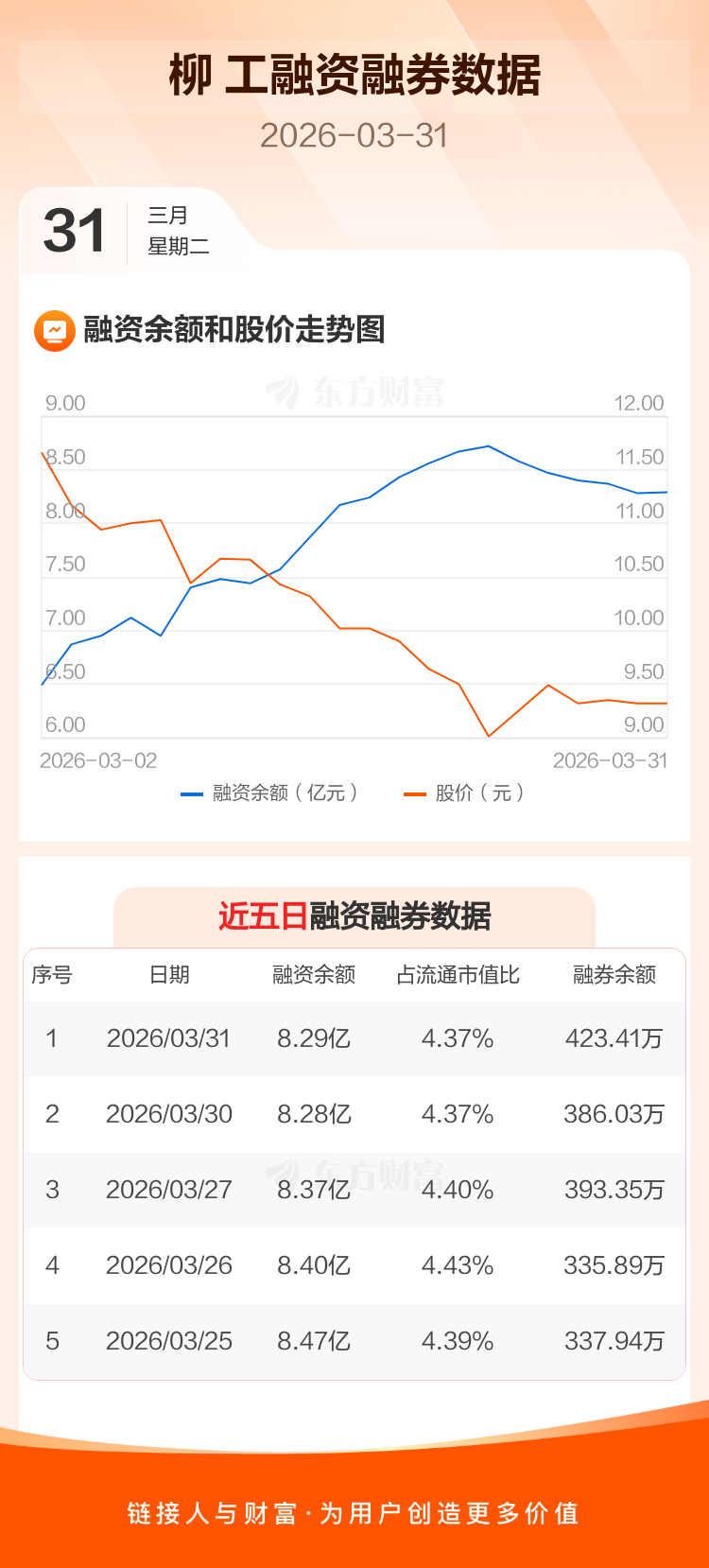 交易所最新数据显示,柳 工于2026年3月31日获融资买入2412.11万元,融资偿还2381.27万元,当日融资净买入30.84万元。目前,该股融资余额8.29亿,占流通市值比例为4.37%。