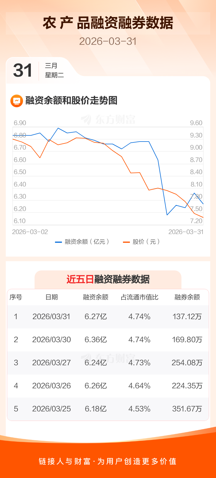交易所最新数据显示,农 产 品于2026年3月31日获融资买入1271.49万元,融资偿还2166.40万元,当日融资净偿还894.91万元。目前,该股融资余额6.27亿,占流通市值比例为4.74%。