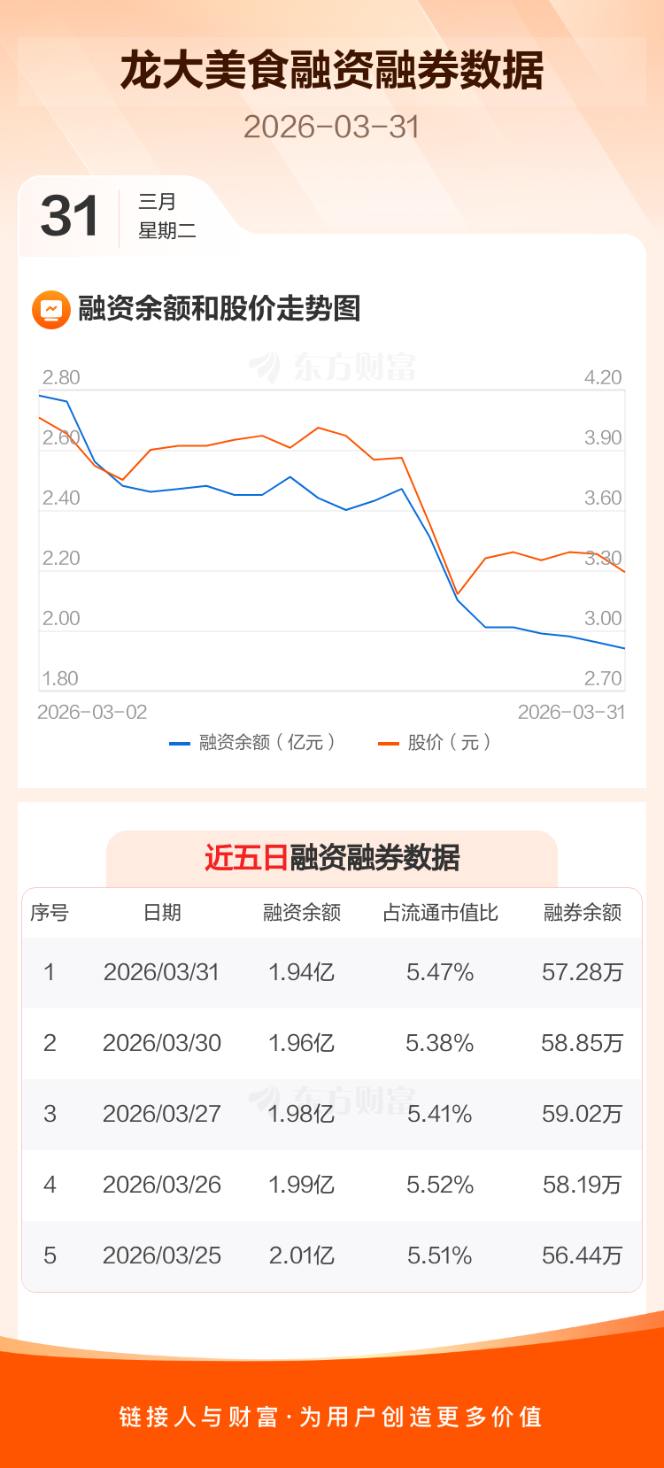 交易所最新数据显示,龙大美食于2026年3月31日获融资买入326.22万元,融资偿还547.47万元,当日融资净偿还221.25万元。目前,该股融资余额1.94亿,占流通市值比例为5.47%。