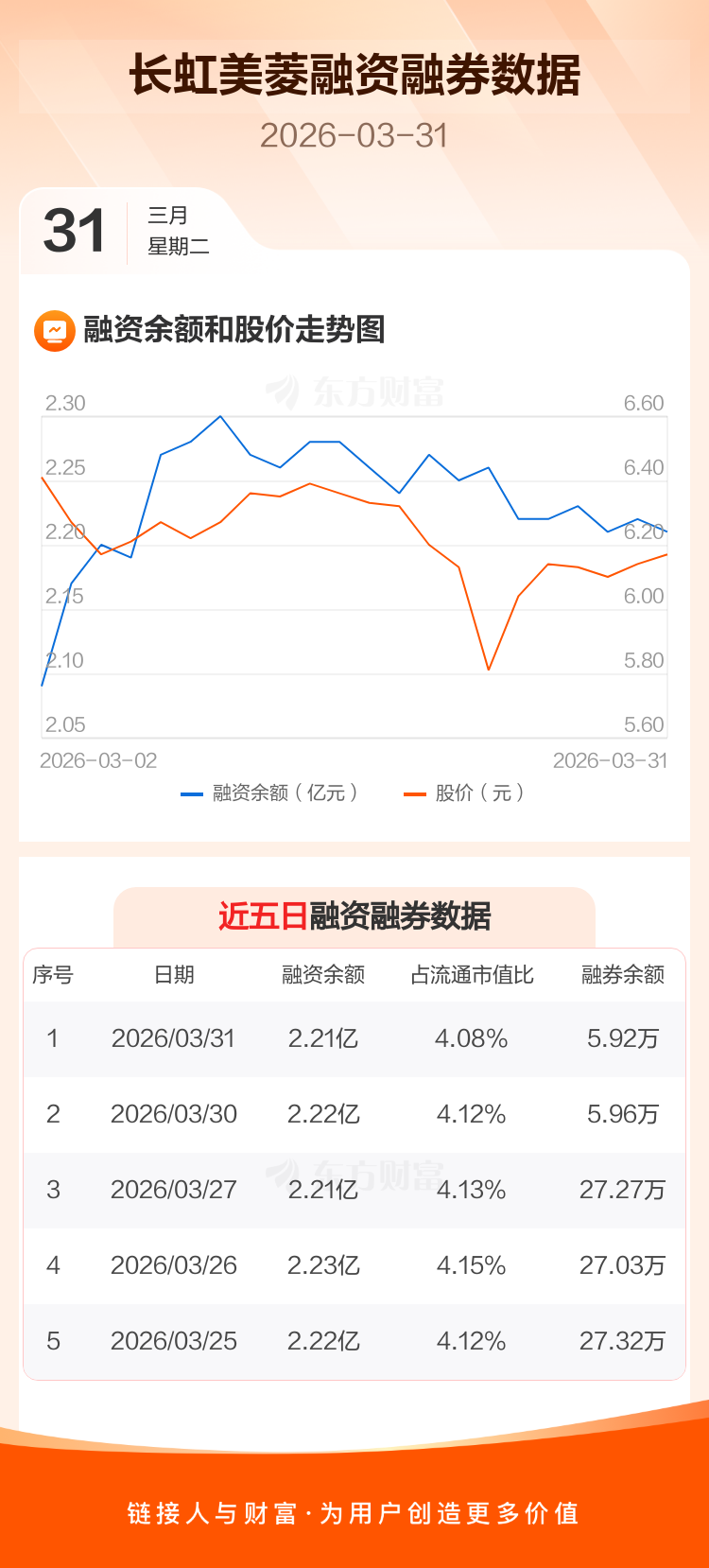 交易所最新数据显示,长虹美菱于2026年3月31日获融资买入481.77万元,融资偿还587.89万元,当日融资净偿还106.12万元。目前,该股融资余额2.21亿,占流通市值比例为4.08%。