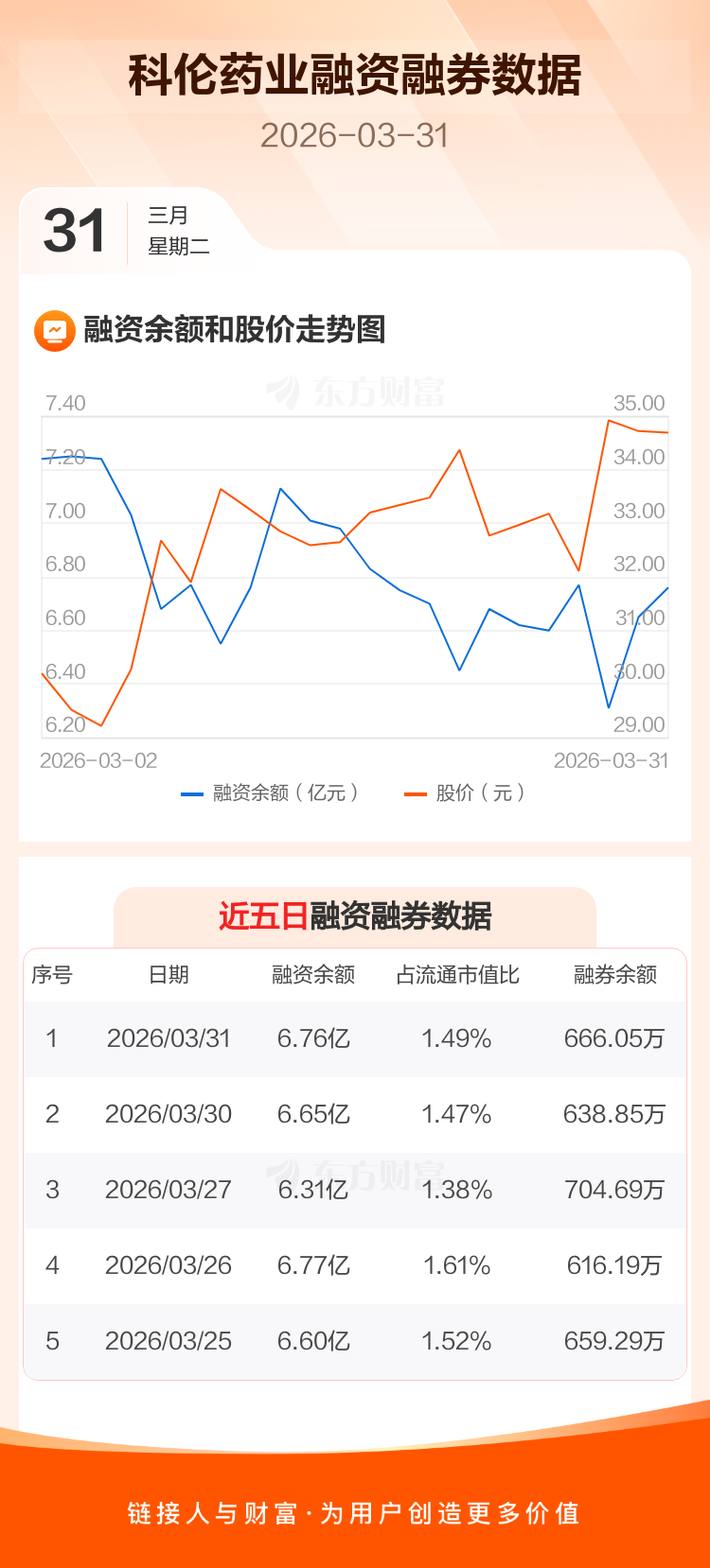 交易所最新数据显示,科伦药业于2026年3月31日获融资买入5267.54万元,融资偿还4262.13万元,当日融资净买入1005.41万元。目前,该股融资余额6.76亿,占流通市值比例为1.49%。
