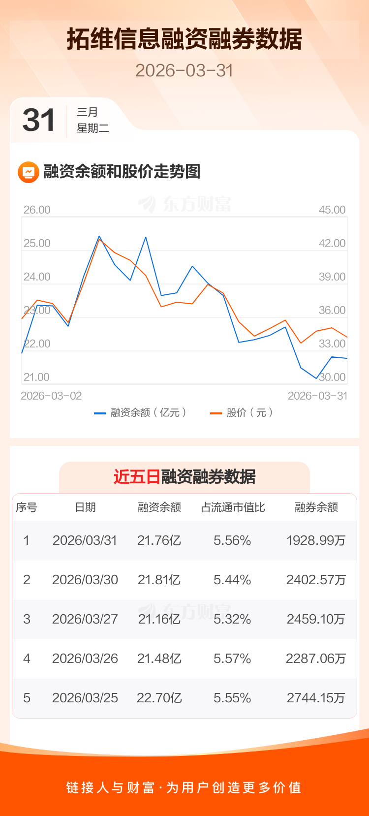 交易所最新数据显示,拓维信息于2026年3月31日获融资买入2.00亿元,融资偿还2.05亿元,当日融资净偿还510.72万元。目前,该股融资余额21.76亿,占流通市值比例为5.56%。