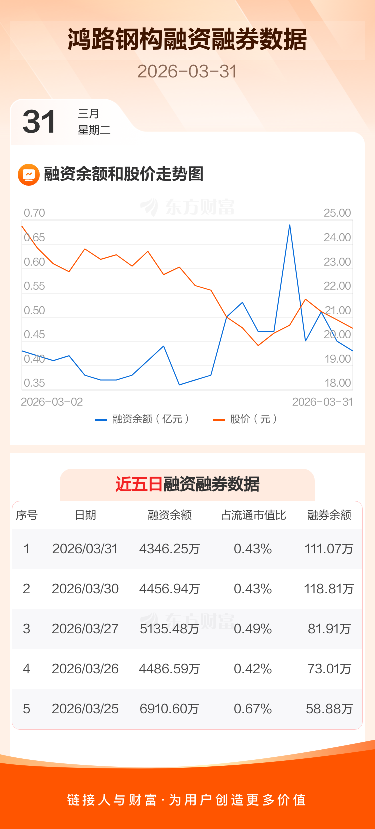 交易所最新数据显示,鸿路钢构于2026年3月31日获融资买入649.00万元,融资偿还759.69万元,当日融资净偿还110.69万元。目前,该股融资余额4346.25万,占流通市值比例为0.43%。