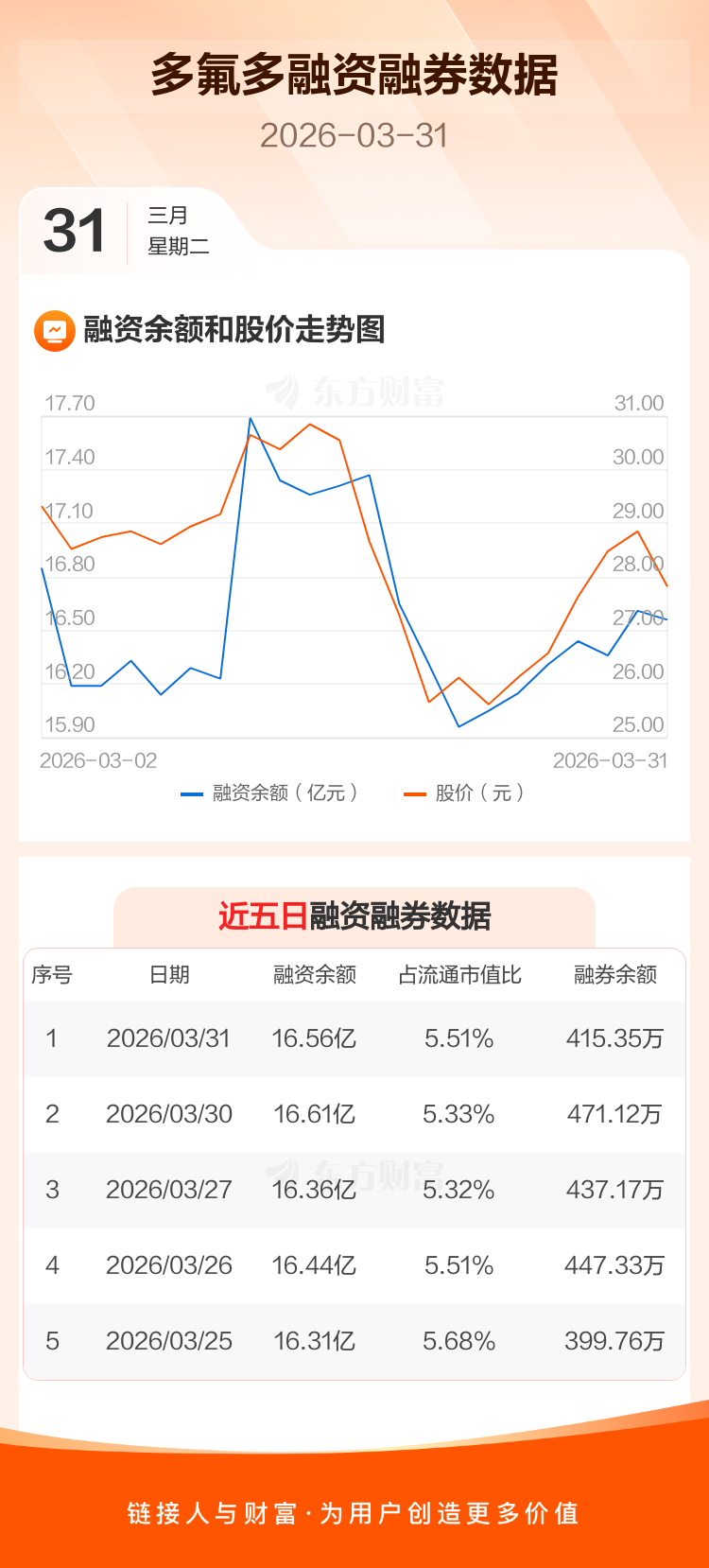 交易所最新数据显示,多氟多于2026年3月31日获融资买入1.36亿元,融资偿还1.41亿元,当日融资净偿还513.33万元。目前,该股融资余额16.56亿,占流通市值比例为5.51%。