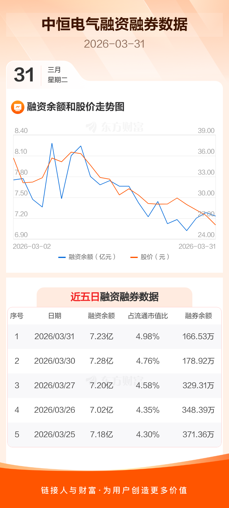 交易所最新数据显示,中恒电气于2026年3月31日获融资买入5041.63万元,融资偿还5542.92万元,当日融资净偿还501.29万元。目前,该股融资余额7.23亿,占流通市值比例为4.98%。