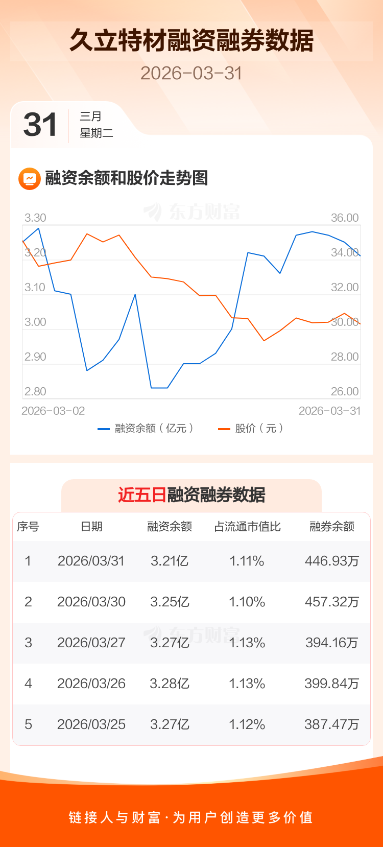 交易所最新数据显示,久立特材于2026年3月31日获融资买入1093.95万元,融资偿还1442.80万元,当日融资净偿还348.85万元。目前,该股融资余额3.21亿,占流通市值比例为1.11%。