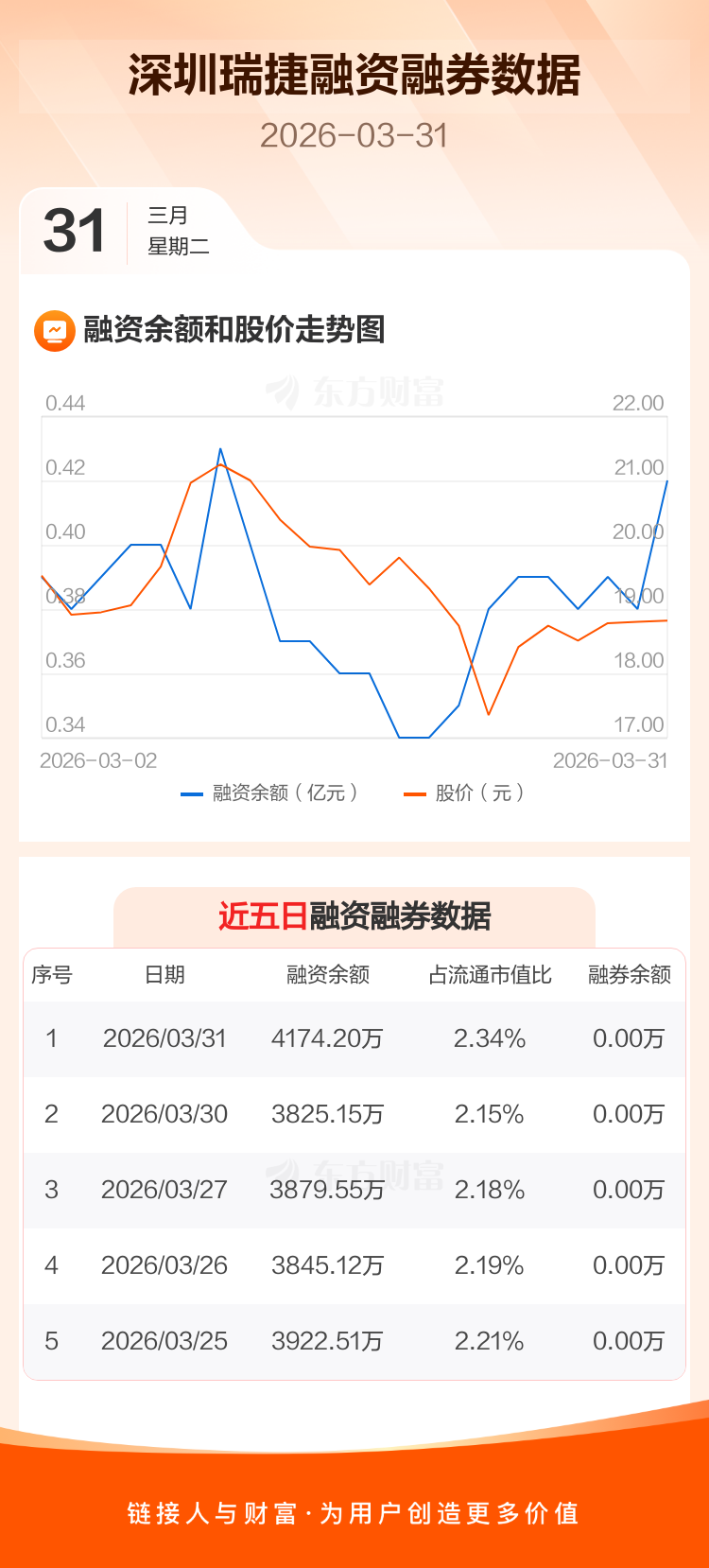 交易所最新数据显示,深圳瑞捷于2026年3月31日获融资买入849.34万元,融资偿还500.29万元,当日融资净买入349.05万元。目前,该股融资余额4174.20万,占流通市值比例为2.34%。