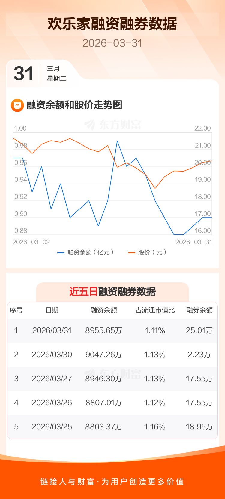 交易所最新数据显示,欢乐家于2026年3月31日获融资买入889.48万元,融资偿还981.09万元,当日融资净偿还91.61万元。目前,该股融资余额8955.65万,占流通市值比例为1.11%。