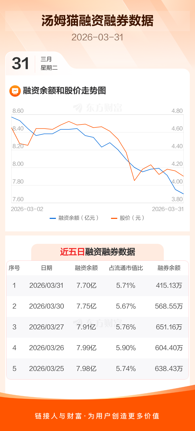 交易所最新数据显示,汤姆猫于2026年3月31日获融资买入1067.36万元,融资偿还1605.92万元,当日融资净偿还538.56万元。目前,该股融资余额7.70亿,占流通市值比例为5.71%。