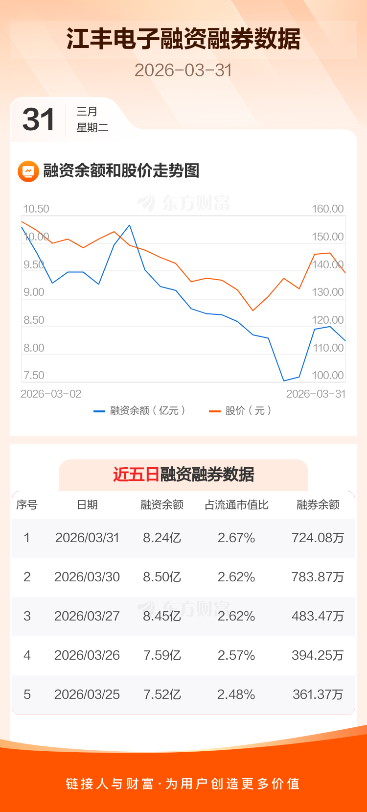 交易所最新数据显示,江丰电子于2026年3月31日获融资买入1.04亿元,融资偿还1.30亿元,当日融资净偿还2599.72万元。目前,该股融资余额8.24亿,占流通市值比例为2.67%。