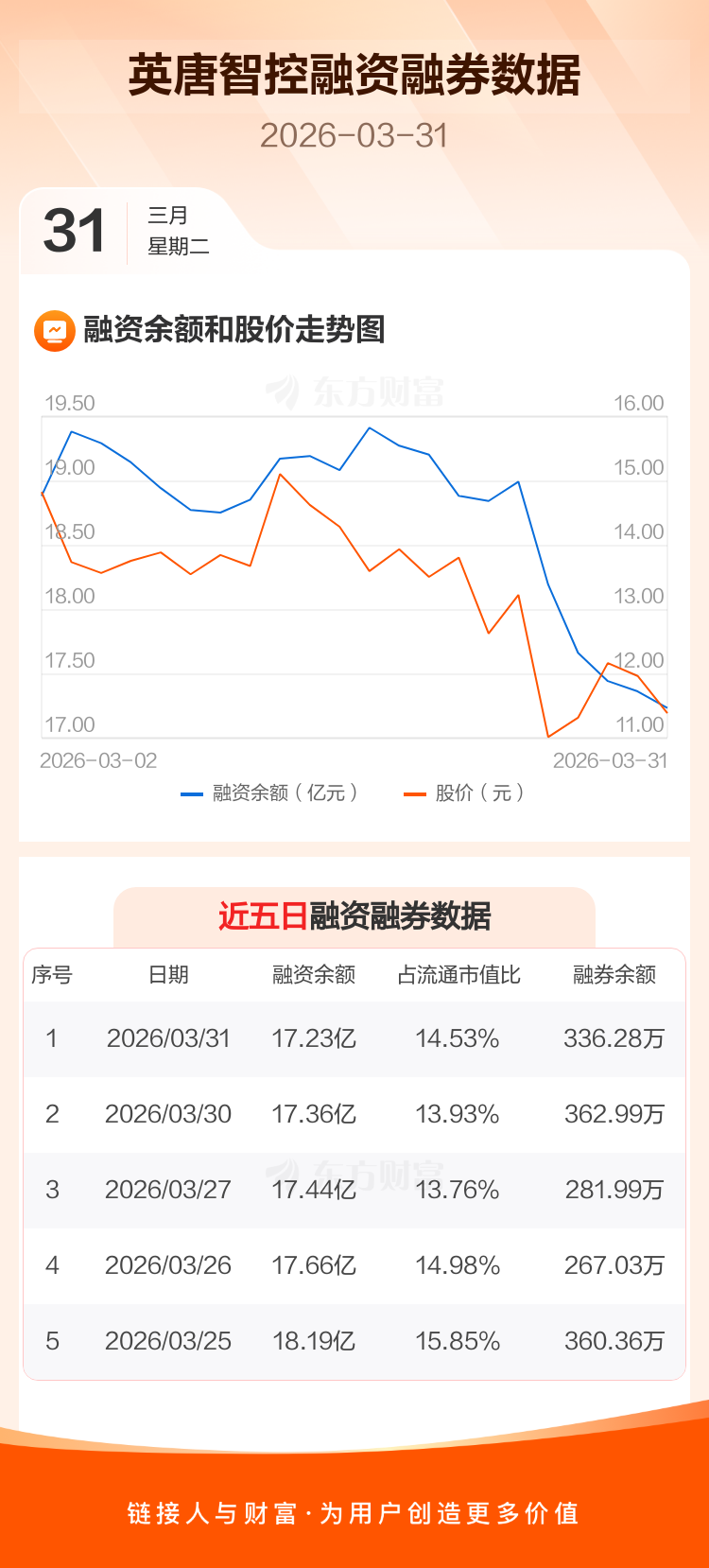交易所最新数据显示,英唐智控于2026年3月31日获融资买入5173.85万元,融资偿还6497.02万元,当日融资净偿还1323.17万元。目前,该股融资余额17.23亿,占流通市值比例为14.53%。