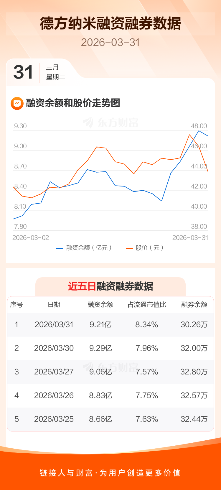交易所最新数据显示,德方纳米于2026年3月31日获融资买入7866.02万元,融资偿还8688.67万元,当日融资净偿还822.66万元。目前,该股融资余额9.21亿,占流通市值比例为8.34%。