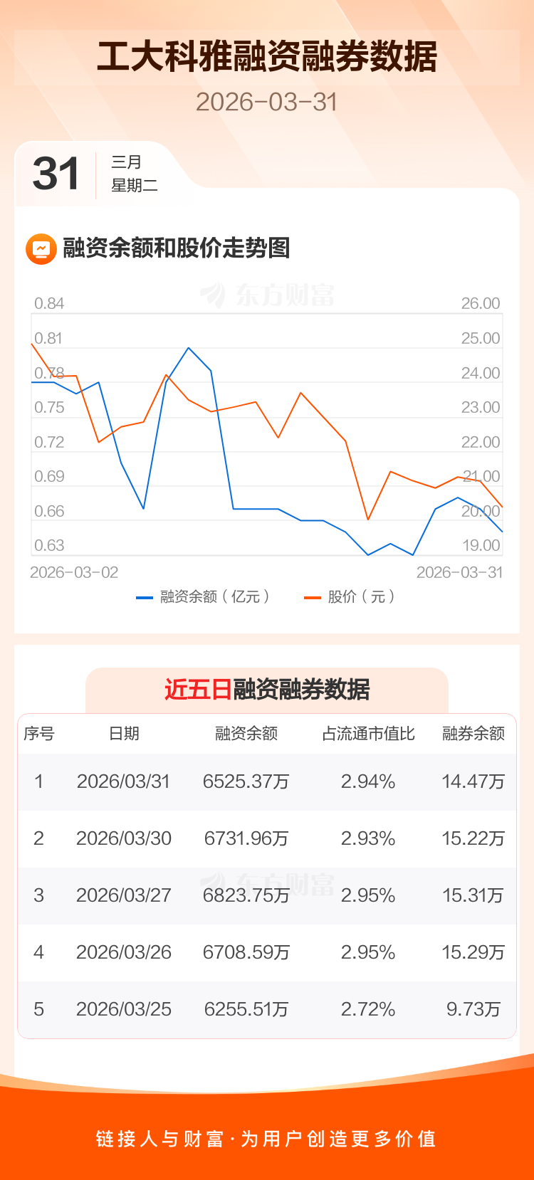 交易所最新数据显示,工大科雅于2026年3月31日获融资买入610.66万元,融资偿还817.25万元,当日融资净偿还206.58万元。目前,该股融资余额6525.37万,占流通市值比例为2.94%。