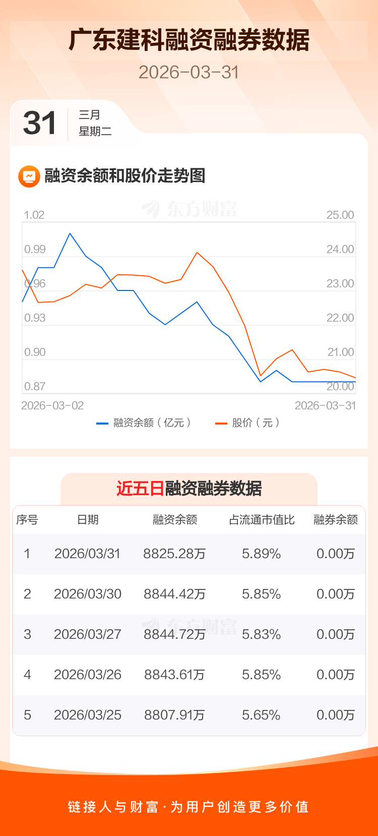 交易所最新数据显示,广东建科于2026年3月31日获融资买入163.80万元,融资偿还182.94万元,当日融资净偿还19.14万元。目前,该股融资余额8825.28万,占流通市值比例为5.89%。