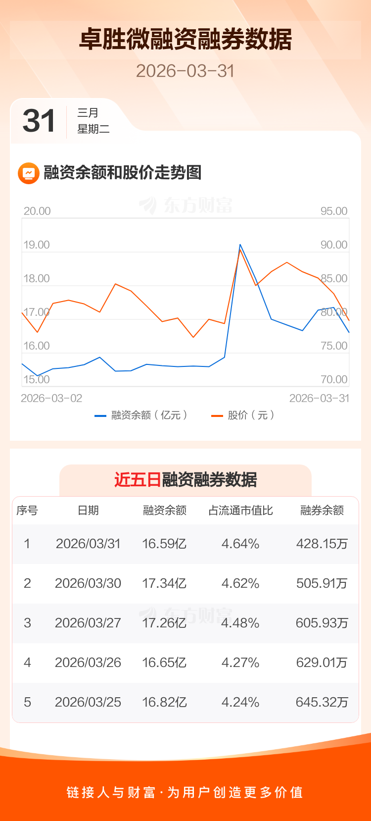 交易所最新数据显示,卓胜微于2026年3月31日获融资买入1.53亿元,融资偿还2.28亿元,当日融资净偿还7533.91万元。目前,该股融资余额16.59亿,占流通市值比例为4.64%。