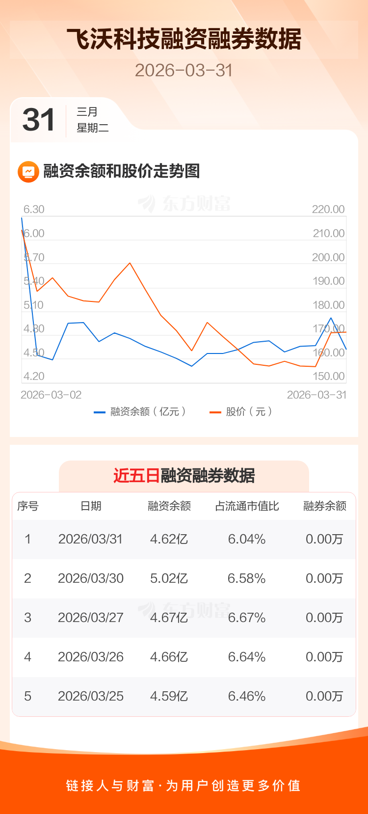 交易所最新数据显示,飞沃科技于2026年3月31日获融资买入9655.88万元,融资偿还1.37亿元,当日融资净偿还4050.08万元。目前,该股融资余额4.62亿,占流通市值比例为6.04%。