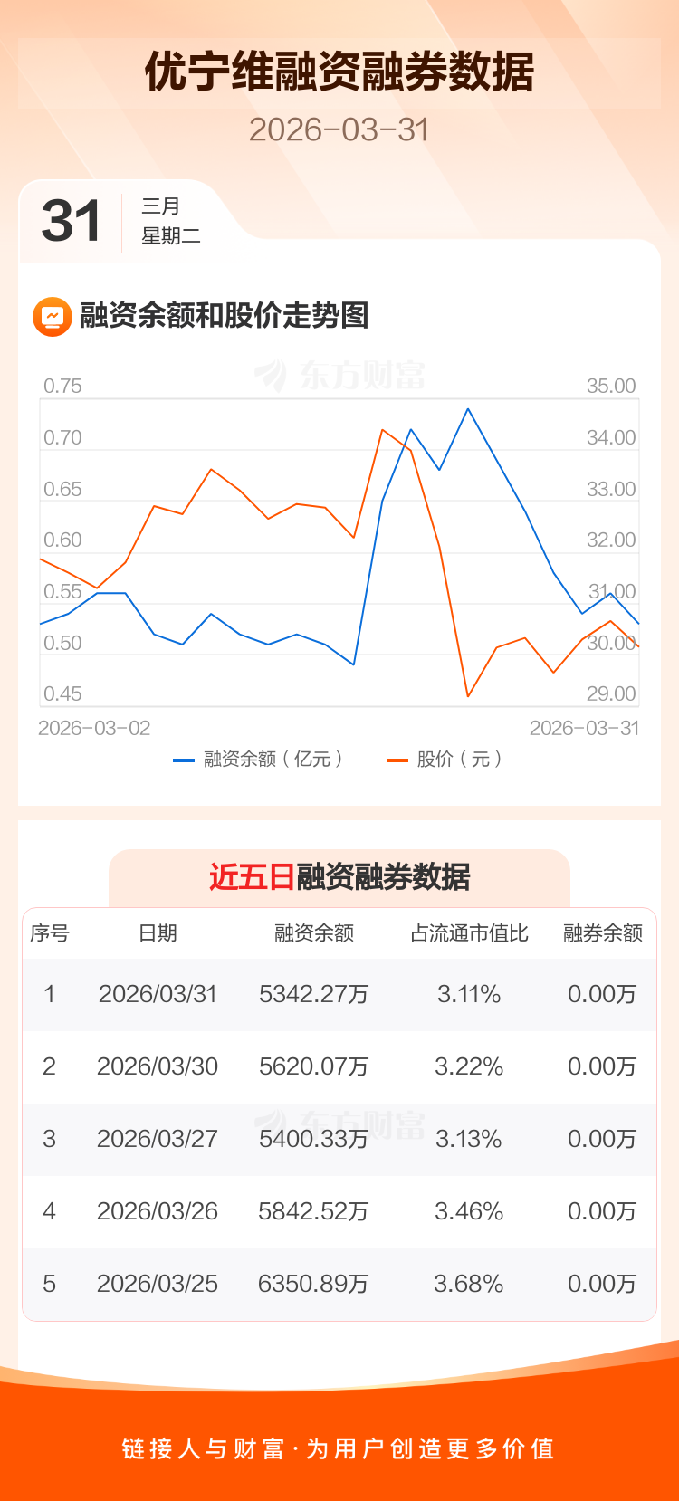 交易所最新数据显示,优宁维于2026年3月31日获融资买入458.86万元,融资偿还736.65万元,当日融资净偿还277.8万元。目前,该股融资余额5342.27万,占流通市值比例为3.11%。