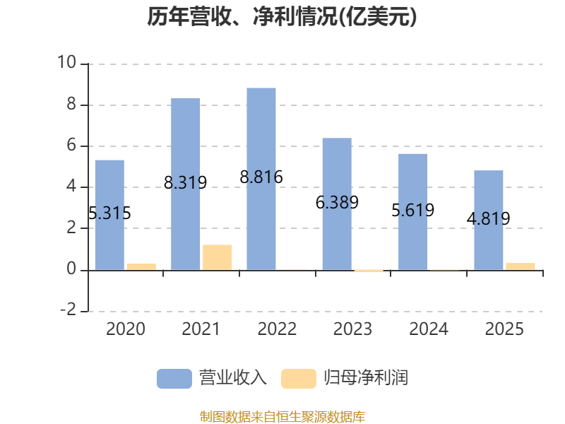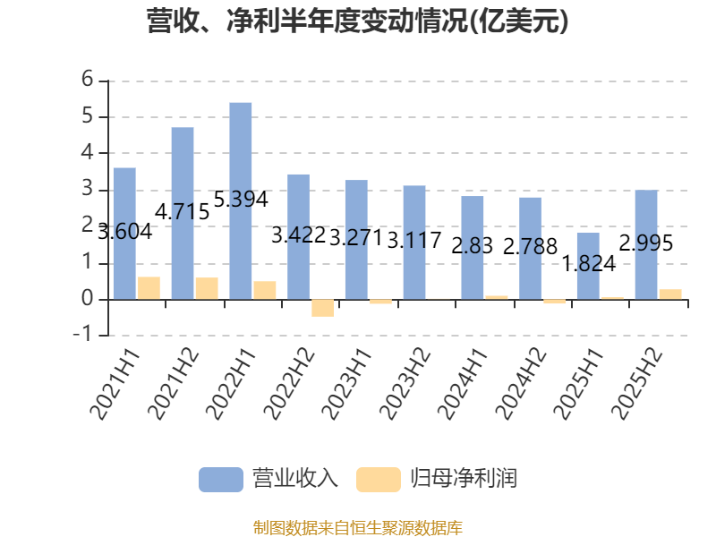 中证智能财讯金川国际(02362)4月1日披露2025年度报告。报告期内,公司实现营业收入4.82亿美元,同比下降14.23%;归母净利润3265.4万美元,同比扭亏;据报告显示,金川国际基本每股收益为0.0025美元,平均净资产收益率为3.19%。