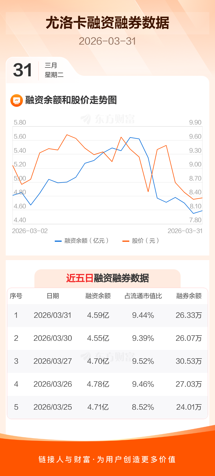 交易所最新数据显示,尤洛卡于2026年3月31日获融资买入2720.25万元,融资偿还2298.94万元,当日融资净买入421.31万元。目前,该股融资余额4.59亿,占流通市值比例为9.44%。