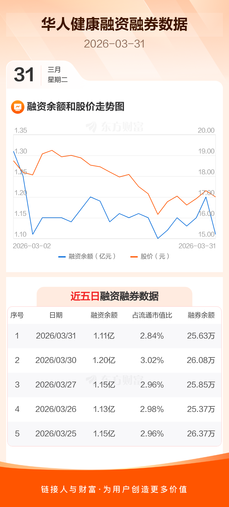交易所最新数据显示,华人健康于2026年3月31日获融资买入874.78万元,融资偿还1783.13万元,当日融资净偿还908.35万元。目前,该股融资余额1.11亿,占流通市值比例为2.84%。