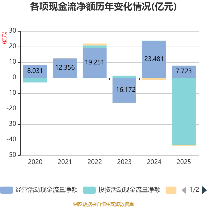 截至2025年,公司经营活动现金流净额为7.72亿元,同比下降67.11%;筹资活动现金流净额-5404.48万元,同比增加1.03亿元;投资活动现金流净额-43.46亿元,上年同期为3778.53万元。