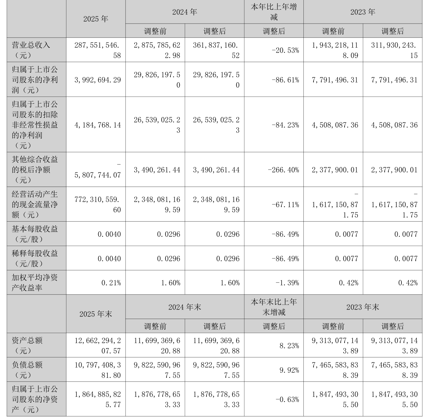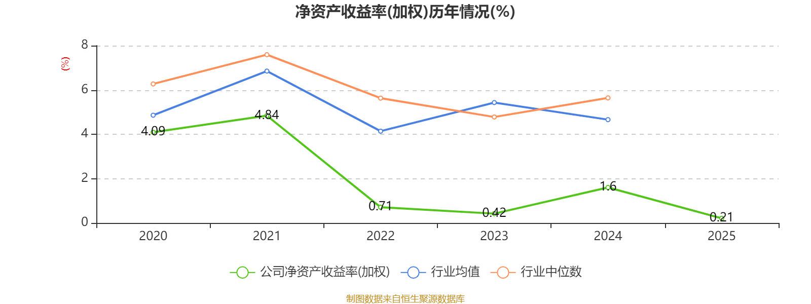 数据显示,2025年公司加权平均净资产收益率为0.21%,较上年同期下降1.39个百分点。