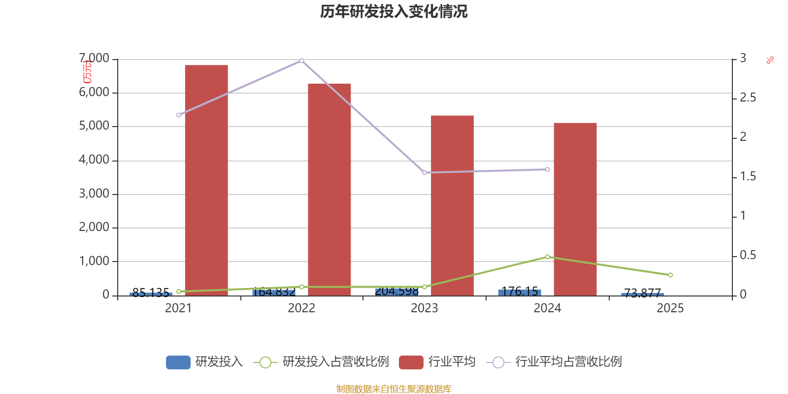 2025年全年,公司研发投入金额为73.88万元,同比下降58.06%;研发投入占营业收入比例为0.26%,相比上年同期下降0.23个百分点。此外,公司全年研发投入资本化率为0%。