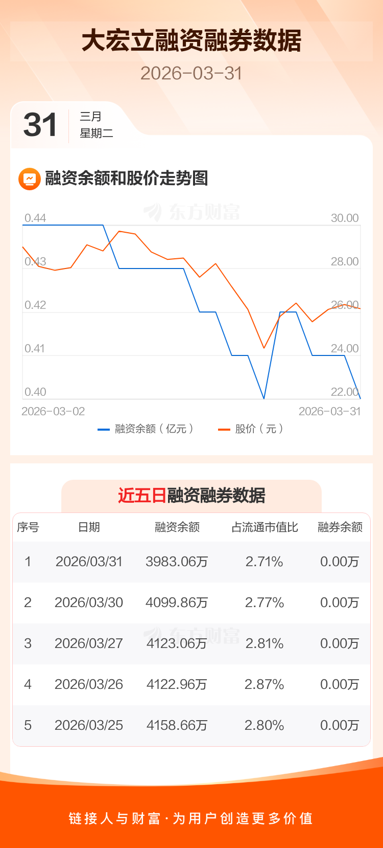 交易所最新数据显示,大宏立于2026年3月31日获融资买入345.47万元,融资偿还462.27万元,当日融资净偿还116.8万元。目前,该股融资余额3983.06万,占流通市值比例为2.71%。