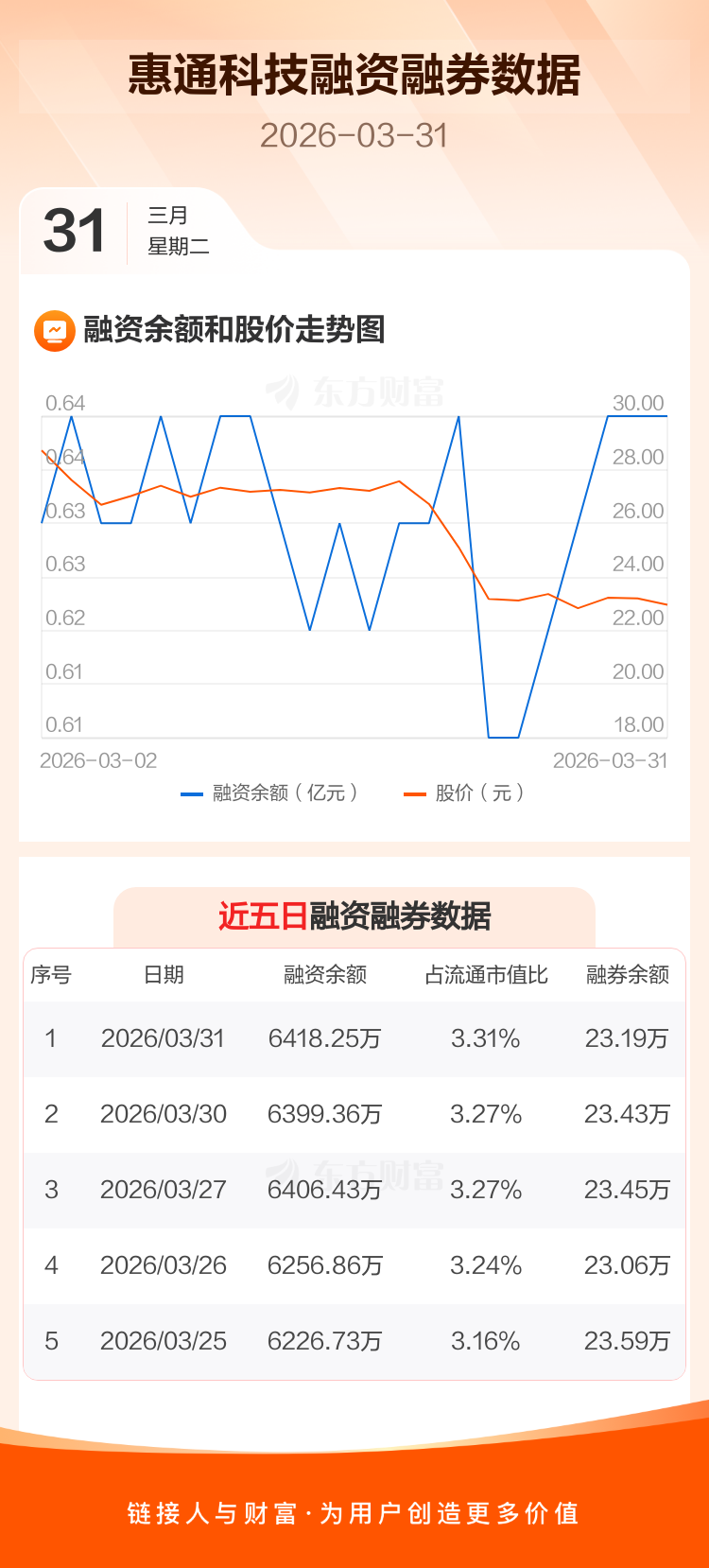 交易所最新数据显示,惠通科技于2026年3月31日获融资买入230.71万元,融资偿还211.83万元,当日融资净买入18.88万元。目前,该股融资余额6418.25万,占流通市值比例为3.31%。