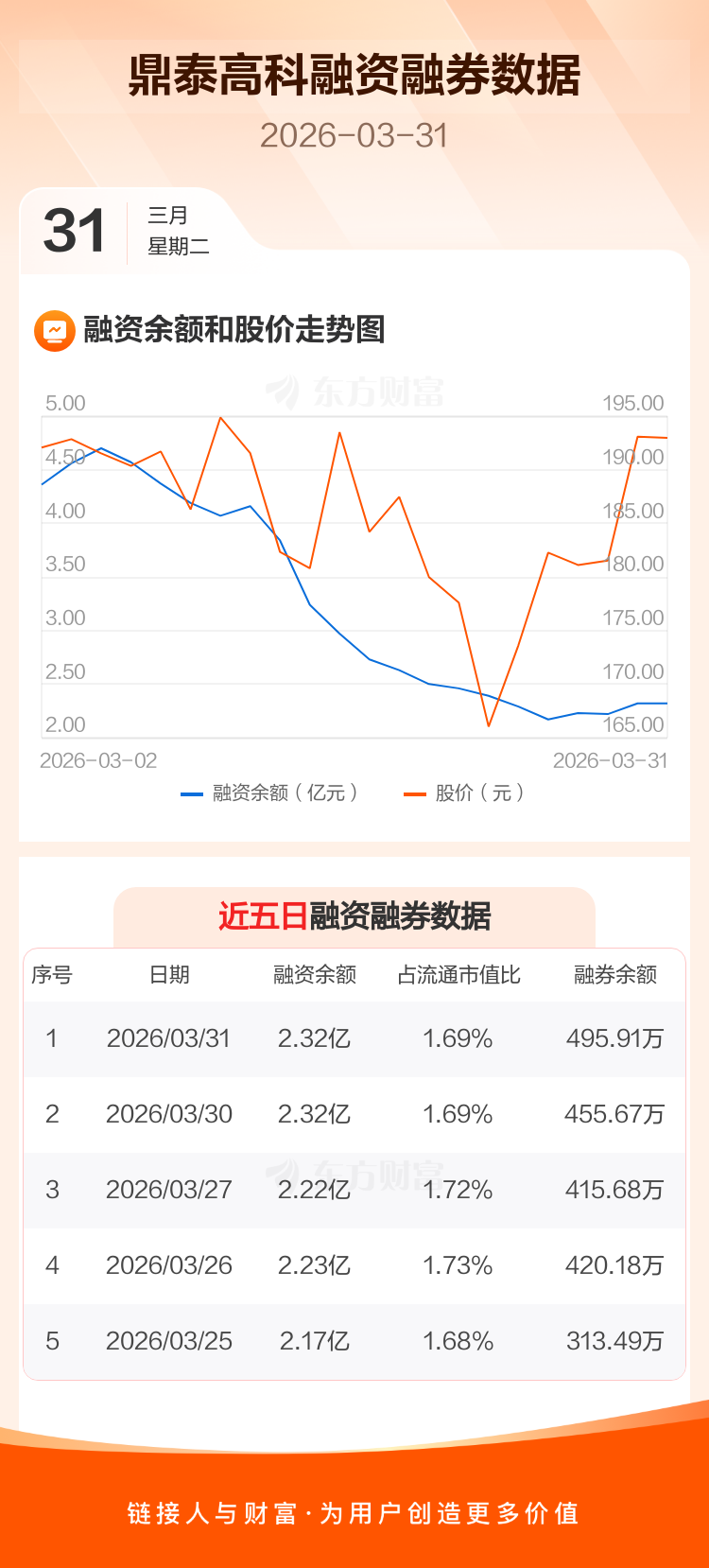 交易所最新数据显示,鼎泰高科于2026年3月31日获融资买入5117.23万元,融资偿还5109.96万元,当日融资净买入7.27万元。目前,该股融资余额2.32亿,占流通市值比例为1.69%。