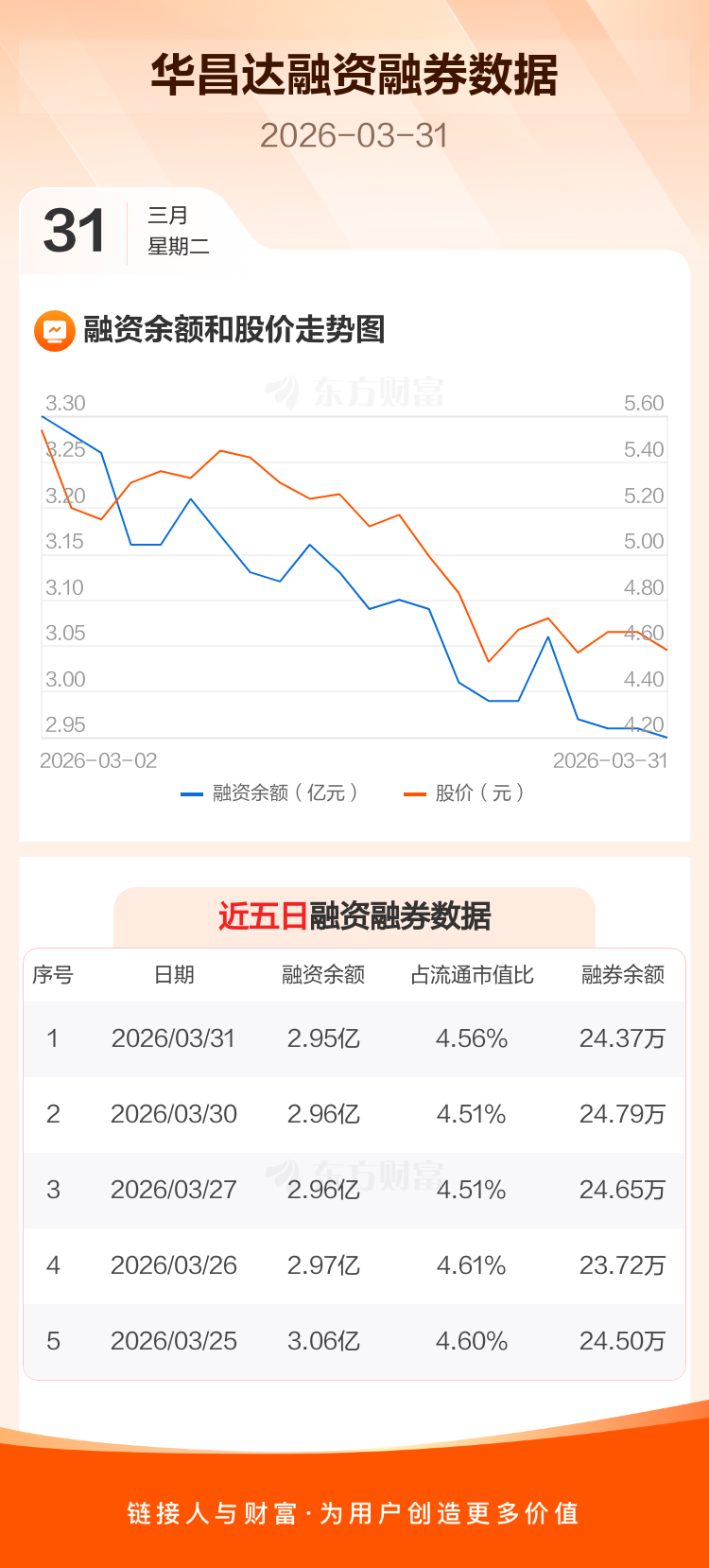 交易所最新数据显示,华昌达于2026年3月31日获融资买入721.14万元,融资偿还870.18万元,当日融资净偿还149.04万元。目前,该股融资余额2.95亿,占流通市值比例为4.56%。