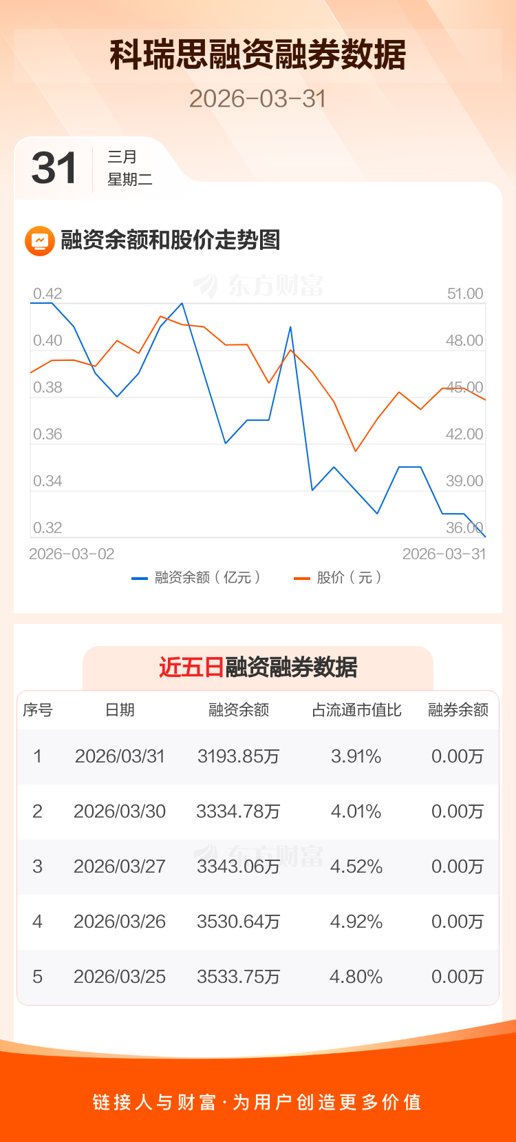 交易所最新数据显示,科瑞思于2026年3月31日获融资买入358.09万元,融资偿还499.02万元,当日融资净偿还140.93万元。目前,该股融资余额3193.85万,占流通市值比例为3.91%。