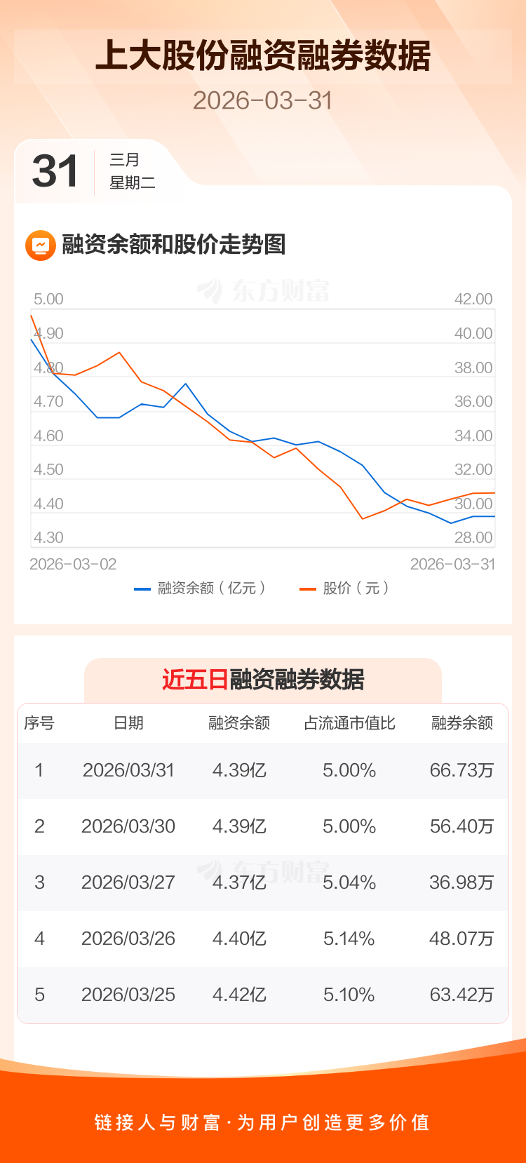 交易所最新数据显示,上大股份于2026年3月31日获融资买入1251.35万元,融资偿还1230.17万元,当日融资净买入21.18万元。目前,该股融资余额4.39亿,占流通市值比例为5.00%。