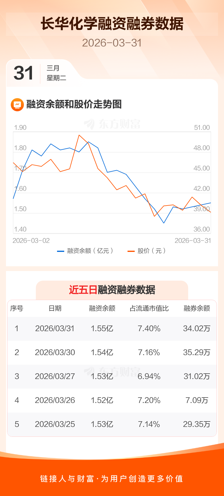 交易所最新数据显示,长华化学于2026年3月31日获融资买入570.80万元,融资偿还456.20万元,当日融资净买入114.61万元。目前,该股融资余额1.55亿,占流通市值比例为7.40%。