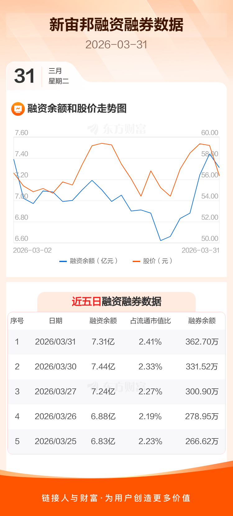 交易所最新数据显示,新宙邦于2026年3月31日获融资买入8912.02万元,融资偿还1.02亿元,当日融资净偿还1326.57万元。目前,该股融资余额7.31亿,占流通市值比例为2.41%。