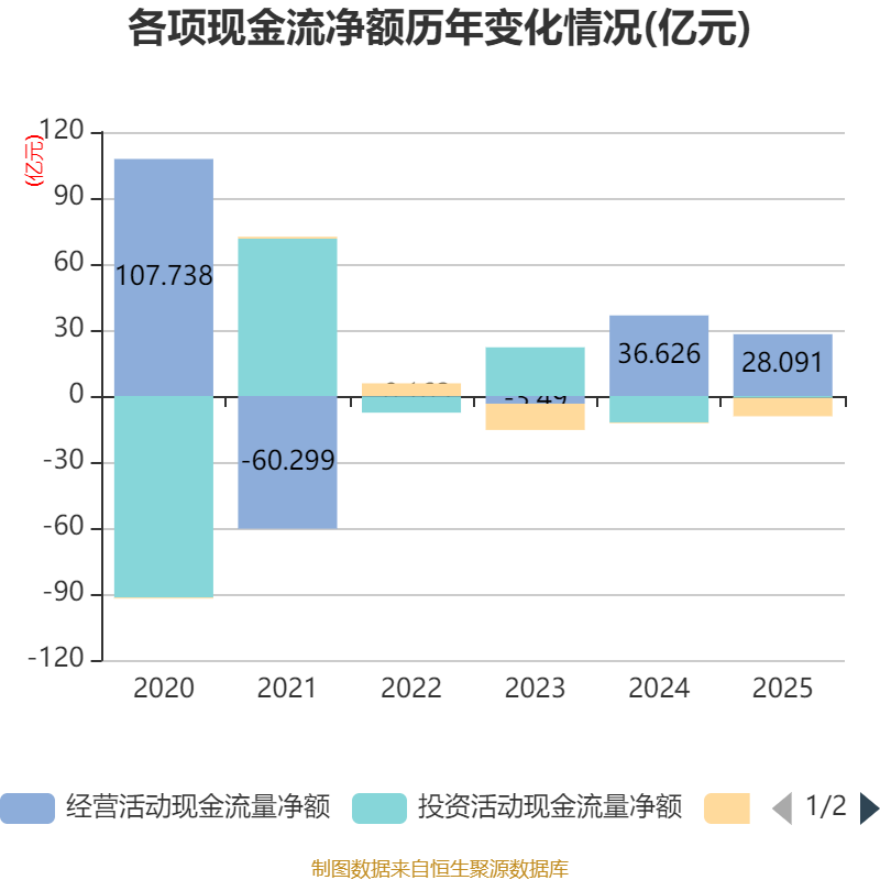 截至2025年,公司经营活动现金流净额为28.09亿元,同比下降23.3%;筹资活动现金流净额-8.37亿元,同比减少8.02亿元;投资活动现金流净额-8465.95万元,上年同期为-12.05亿元。