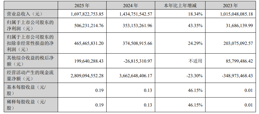 中证智能财讯华林证券(002945)4月1日披露2025年年度报告。2025年,公司实现营业总收入16.98亿元,同比增长18.34%;归母净利润5.06亿元,同比增长43.35%;扣非净利润4.65亿元,同比增长24.29%;经营活动产生的现金流量净额为28.09亿元,同比下降23.30%;报告期内,华林证券基本每股收益为0.19元,加权平均净资产收益率为7.28%。公司2025年度分配预案为:拟向全体股东每10股派现0.57元(含税)。