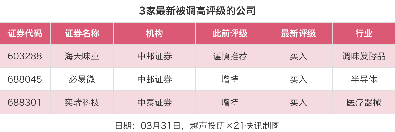 评级调高方面,3月31日,券商调高上市公司评级达到3家次,最新数据包括了中邮证券对海天味业的评级从“谨慎推荐”调高至“买入”,中邮证券对必易微的评级从“增持”调高至“买入”,中泰证券对奕瑞科技的评级从“增持”调高至“买入”。